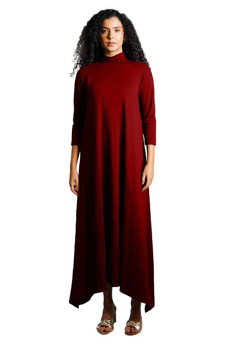 Asymmetric Hem Maroon Cotton Jersey Shift Dress