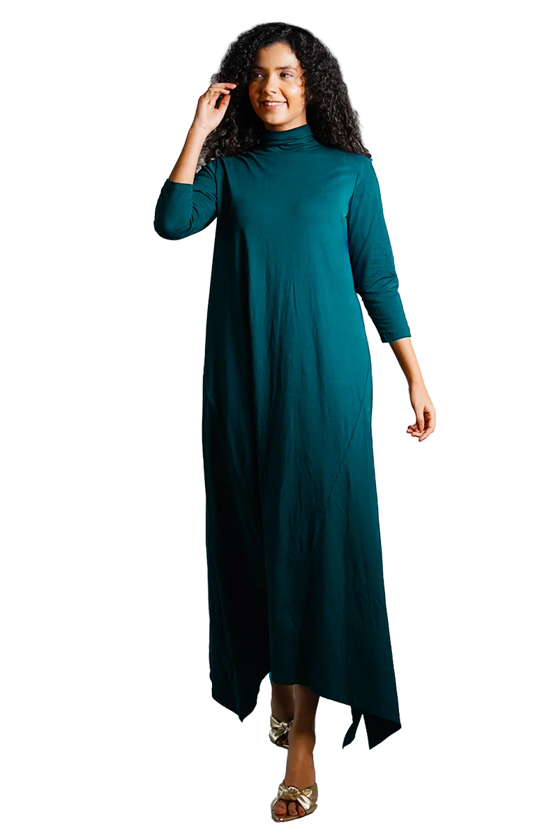 Asymmetric Hem Teal Cotton Jersey Shift Dress
